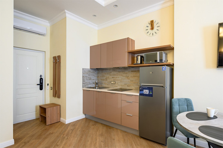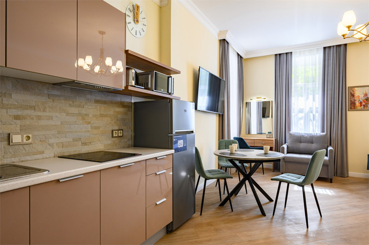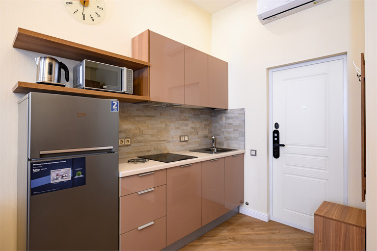 - Оборудование: гладильная доска, микроволновая печь, набор посуды, плита электрическая, посудомоечная машина, сейф, стиральная машина, телевизор, утюг, холодильник, электрочайник