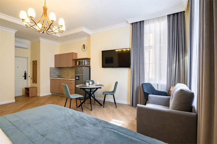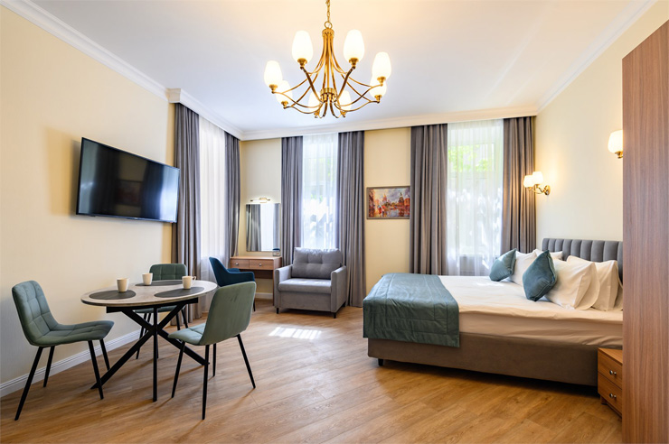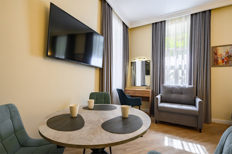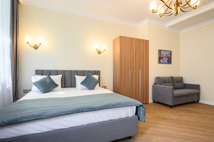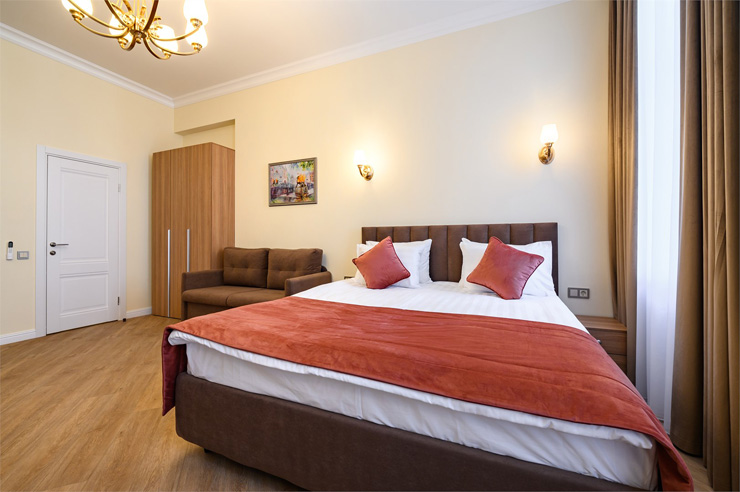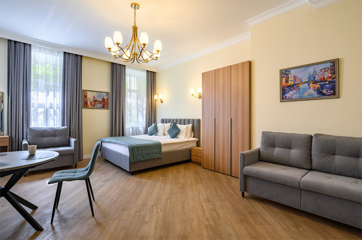 | Апартаменты "Кинг-Сайз" с видом во внутренний дворик | 35 кв.м. | 4 чел. | Мебель (вешалка, диван раскладной, зеркало, кресло-кровать, кровать двуспальная, прикроватные тумбоч... |